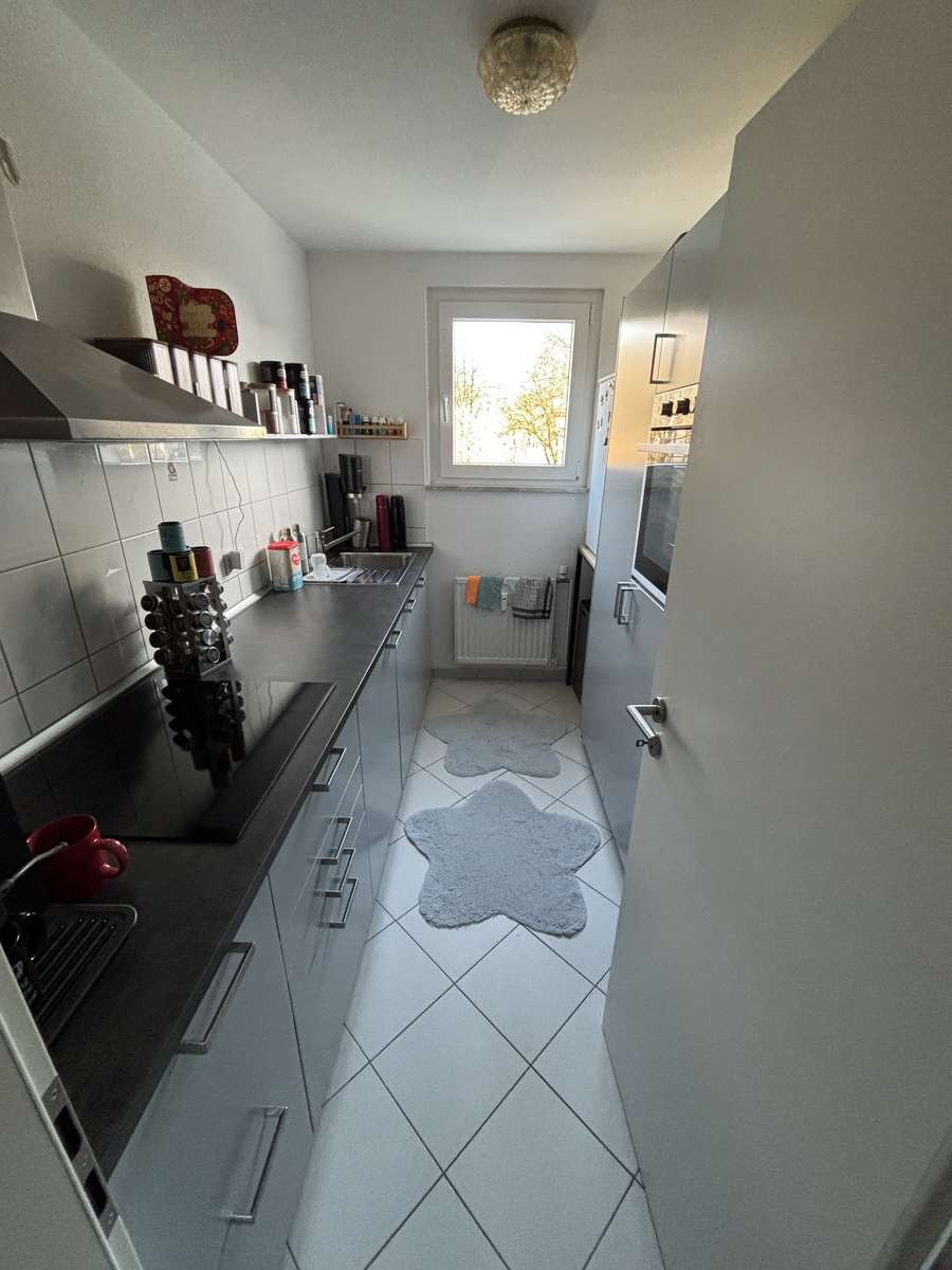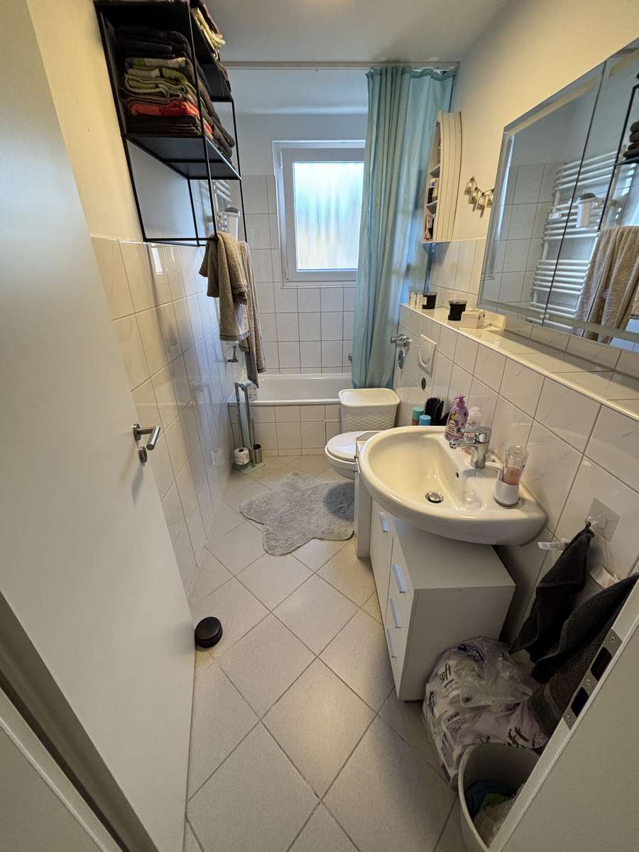 Die Wohnung ist wie folgt ausgestattet: - weiß gefliestes Badezimmer mit Duschwanne und Fenster - weiße Zimmertüren - Gas-Zentral-Heizung Laminatböden können vom Vormieter übernommen werden.